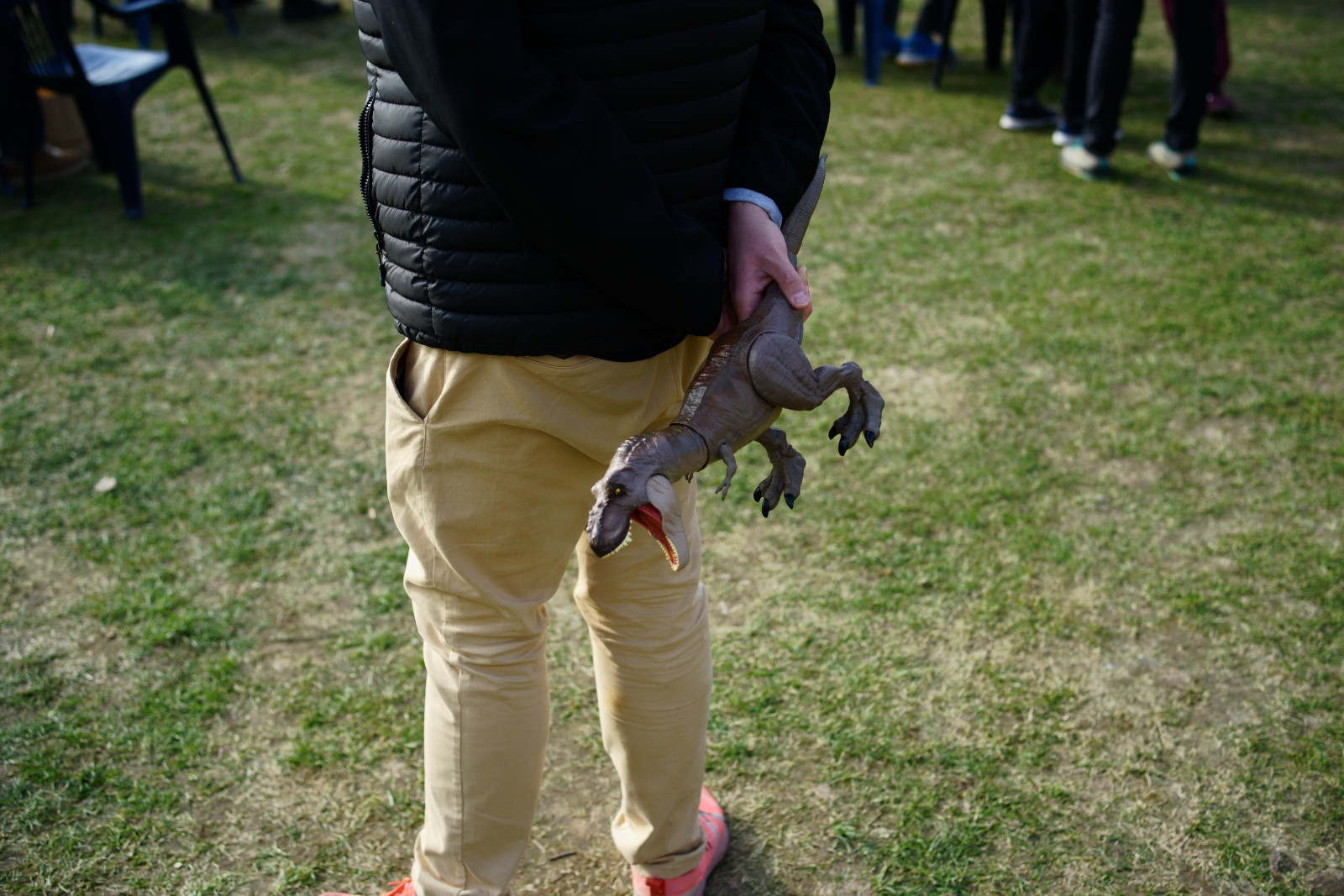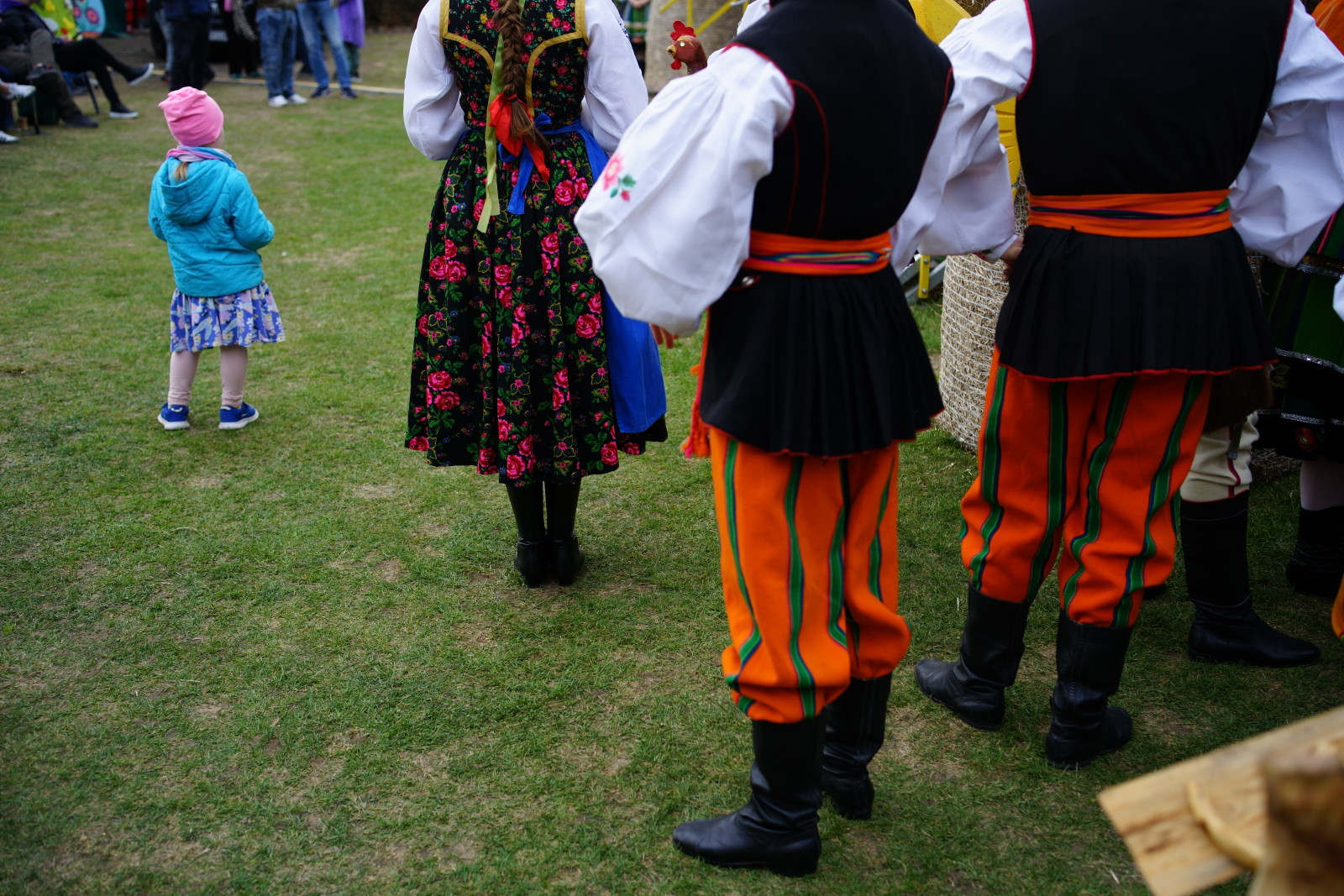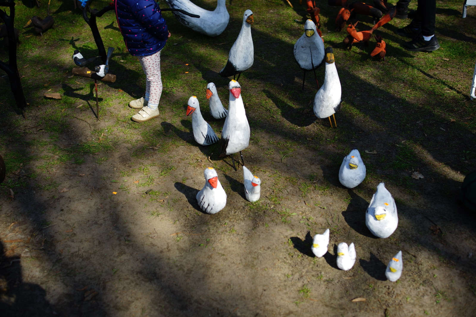 Na pobliskim trawniku przebywały rozstawione, wyrzeźbione w drewnie gęsi i kaczki, wśród których dorośli fotografowali swoje pociechy. Na tle dominujących strojów współczesnych od razu rzucały się w oczy stroje ludowe – w szczególności osób zaangażowanych w występy sceniczne.